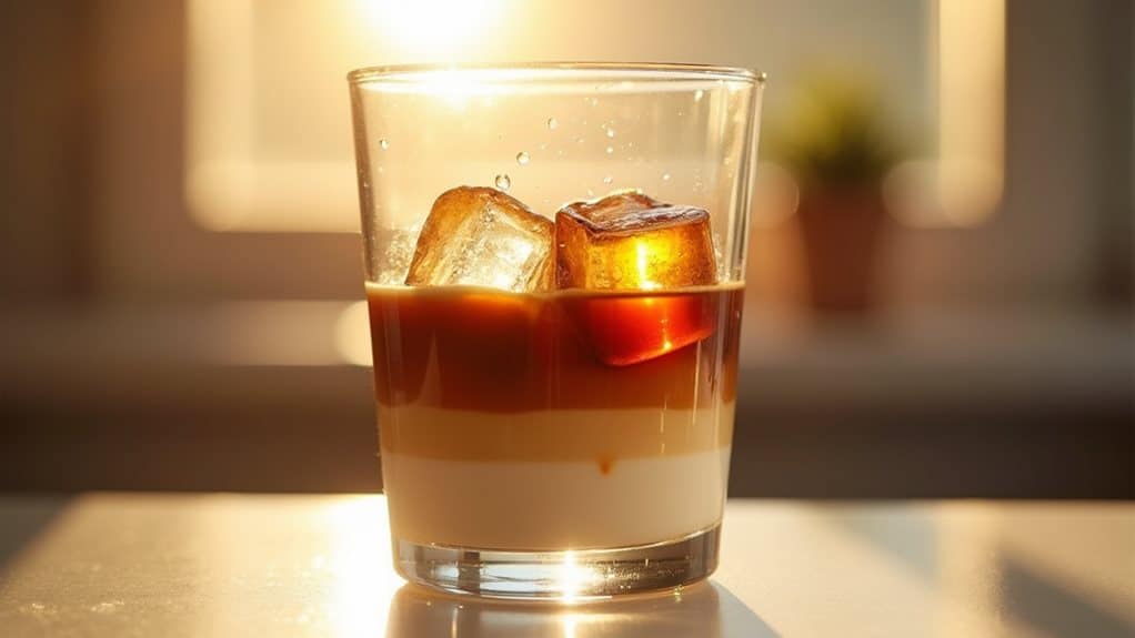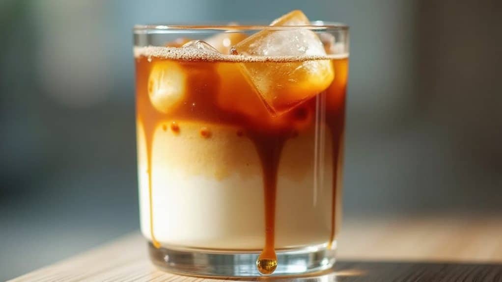 An upside-down iced caramel macchiato reverses the traditional layering sequence of the classic drink, creating a distinctly different taste experience. Instead of starting with vanilla syrup and milk, you'll find caramel sauce at the bottom, followed by milk, ice, and espresso shots on top. This reversal means you'll taste the rich caramel sweetness immediately, rather than waiting for it to mix through the drink. Your barista will layer each ingredient carefully to maintain visual appeal while presenting a bolder coffee profile. The inverted preparation method offers just one way to customize this popular beverage to your preferences. Understanding the layering technique opens up even more possibilities for personalization.
